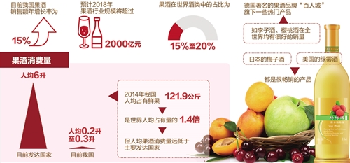 荔枝酒、楊梅酒、桑椹酒、五味子酒、藍(lán)莓酒、蘋果酒……隨著人們健康消費(fèi)意識(shí)的提升,如今以葡萄酒為代表的果酒產(chǎn)業(yè)正迎來(lái)新的發(fā)展機(jī)遇期。《2014年至2018年中國(guó)果酒研究報(bào)告》顯示,目前我國(guó)果酒銷售額年增長(zhǎng)率為15%,預(yù)計(jì)2018年果酒行業(yè)規(guī)模將超過(guò)2000億元。