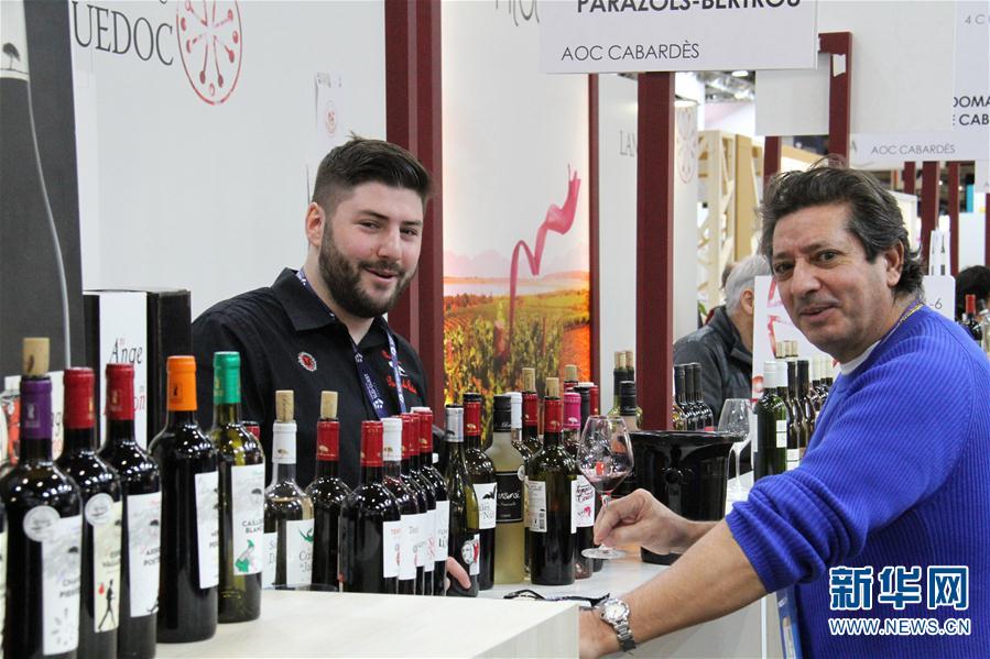 2月12日,在法國巴黎國際葡萄酒及烈酒博覽會上,一名男子品嘗紅酒。 新華社記者 徐永春 攝