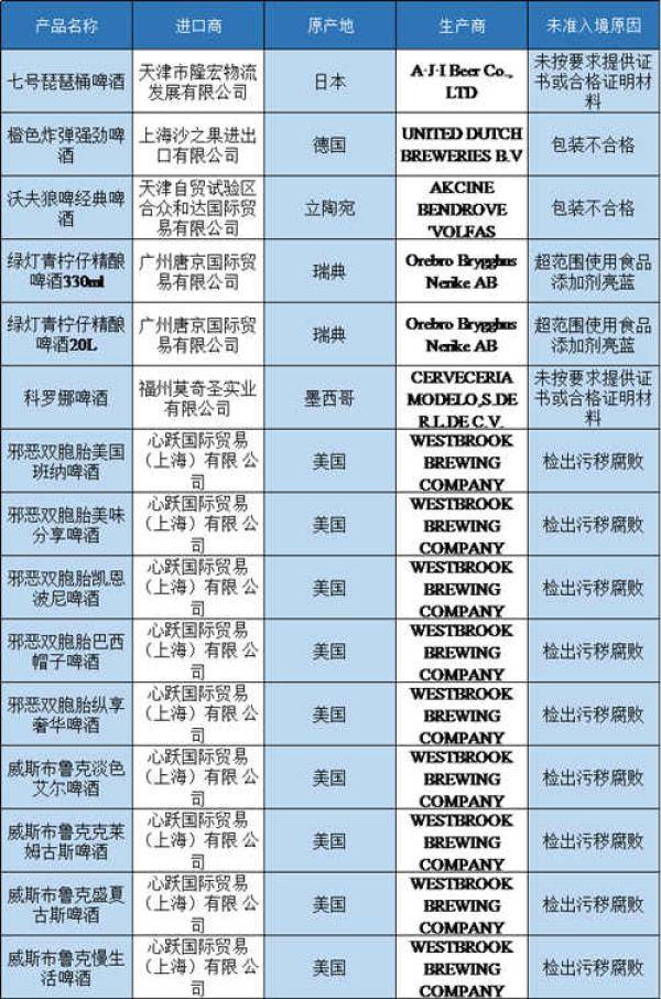 然而根據(jù)海關(guān)通告,心躍國際貿(mào)易(上海)有限公司進口的,美國WESTBROOK BREWING COMPANY生產(chǎn)的5批次邪惡雙胞胎系列精釀啤酒檢出污穢腐敗;另外該公司進口的,同是該生產(chǎn)商生產(chǎn)的16批次威斯布魯克系列精釀啤酒也檢出污穢腐敗。