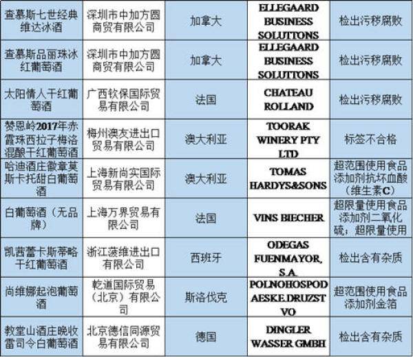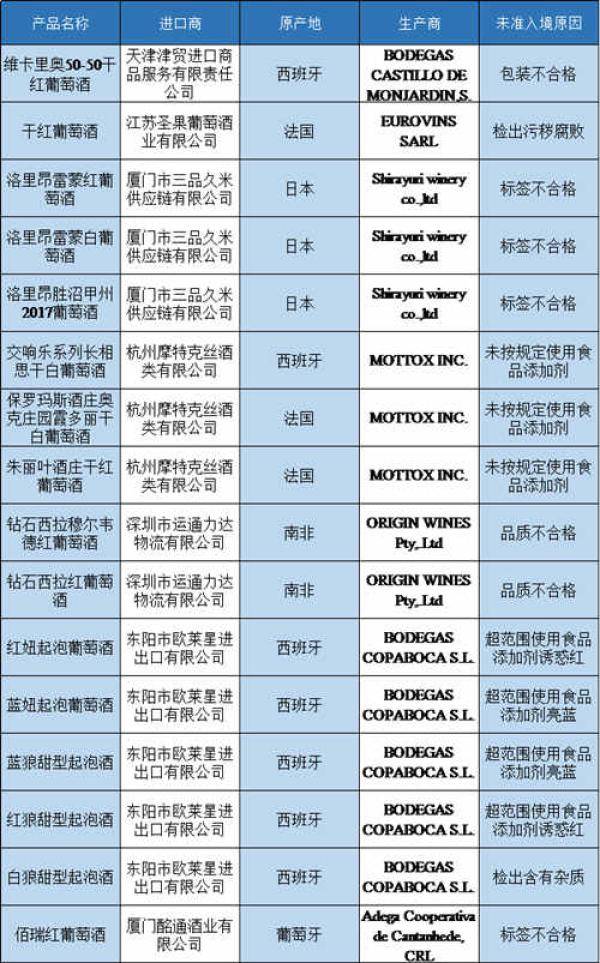 例如,杭州摩特克絲酒類有限公司進口的,MOTTOX INC.生產(chǎn)的三批次葡萄酒違規(guī)使用食品添加劑;東陽市歐萊星進出口有限公司進口的,原產(chǎn)于西班牙的四批次起泡酒超范圍使用食品添加劑誘惑紅、亮藍;上海萬界貿(mào)易有限公司進口,原產(chǎn)于法國的白葡萄酒超限量使用食品添加劑二氧化硫、山梨酸。