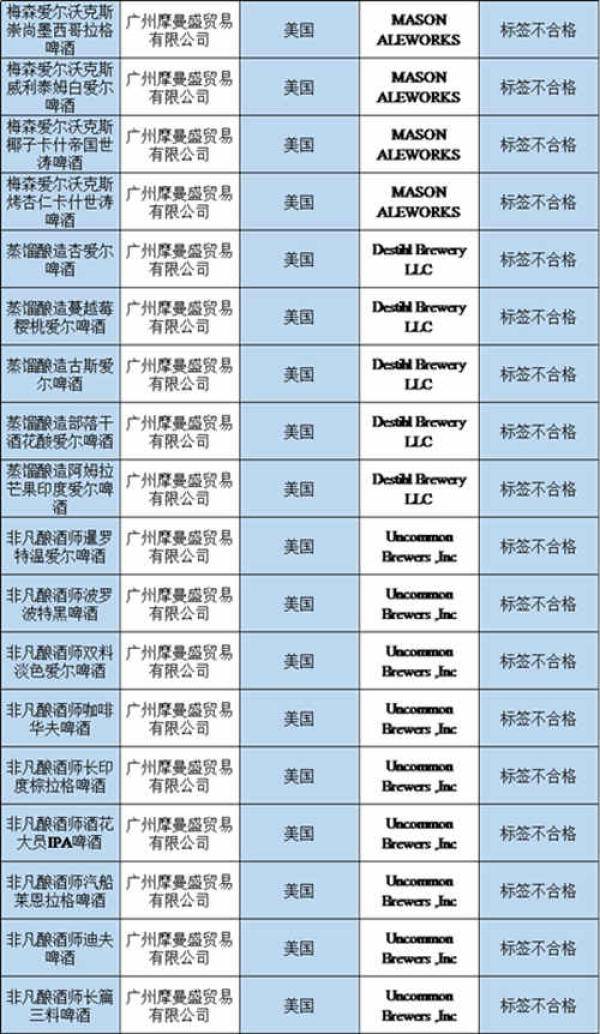 標簽不合格也成為了進口精釀啤酒被拒絕入境的原因之一,廣州摩曼盛貿(mào)易有限公司進口的,美國MASON ALEWORKS、美國Destihl Brewery LLC、美國Uncommon Brewers ,Inc共3家生產(chǎn)商生產(chǎn)的多達22批次精釀啤酒因標簽不合格被拒絕入境。