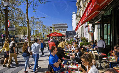 巴黎的露天咖啡館也是街頭一景:一排排藤椅面向街道擺放,將人行道變成露天劇場,人們不僅在這里進餐,也享受“閑適的奢侈”?!拔沂莵砗染坪涂礋狒[的。”一位坐在巴黎露天咖啡座上的德國顧客說,“我喜歡這里。德國也有咖啡館,但沒有閑坐看人的文化?!?