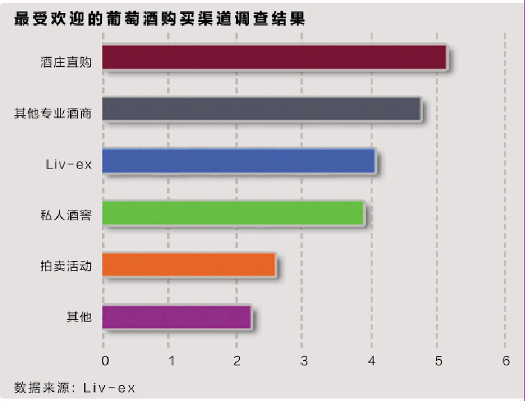 接受調查的酒商買家有近50%表示,直接從酒莊采購葡萄酒是他們的首選。該渠道滿足他們列出的兩個最重要的要求:價格和出處。他們的第二優先選擇是從其他專業的葡萄酒銷售商那里購買,例如進口商和分銷商。雖然這同樣可以獲取更多的葡萄酒,但通常以降低利潤為代價。排在第三位的是全球葡萄酒交易平臺Liv-ex,接受調查的買家中約有1/3將Liv-ex列為他們采購精品葡萄酒的第一或第二選擇。第四是從私人客戶酒窖購買,而拍賣僅排在第五位。