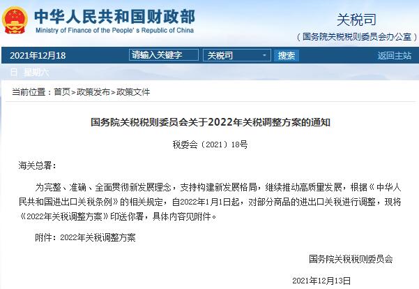 國務院關稅稅則委員會發布通知,自2022年1月1日起,對部分商品的進出口關稅進行調整 。